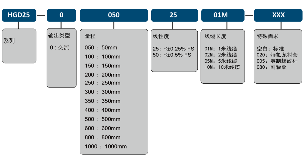 HGD25系列有多种技术指标可供客户选择,除了选型表中已经提供的选项,还可依据客户的要求进行多方面定制,包括耐辐射辐照、特氟龙铁芯防磨衬垫、螺纹规格、出线方式、接头类型等诸多方面的需求。